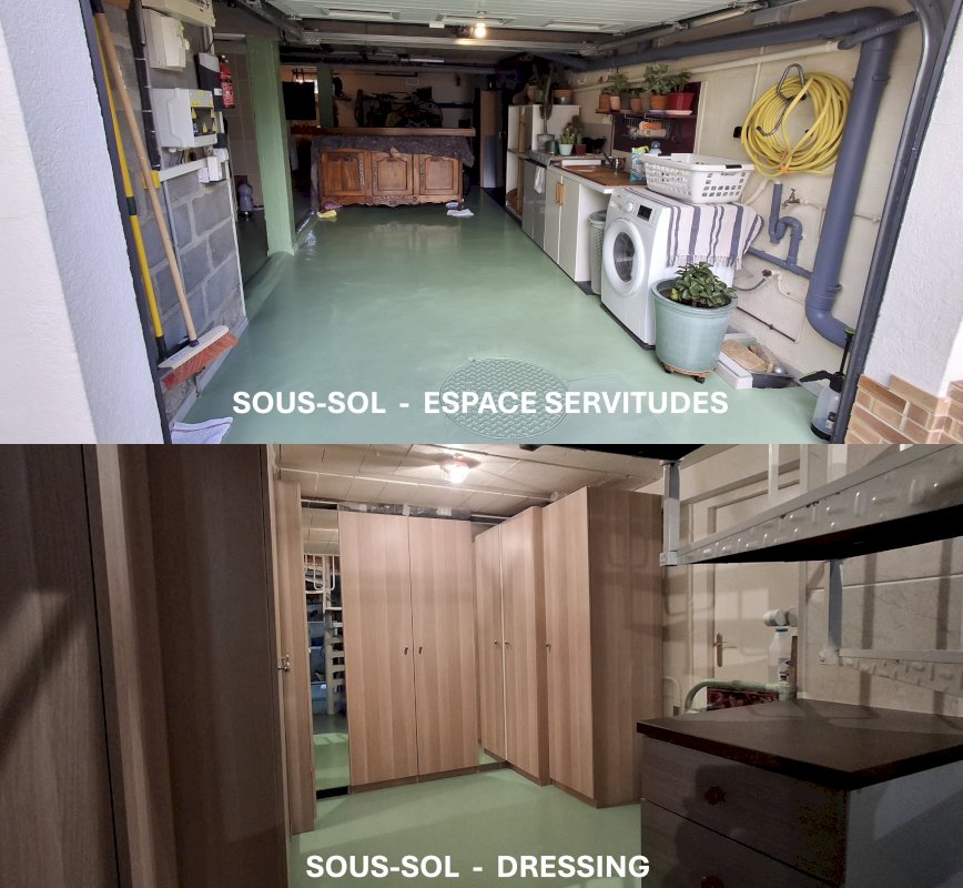 Sous-sol : dressing, cellier, étendoir, espace rangement.