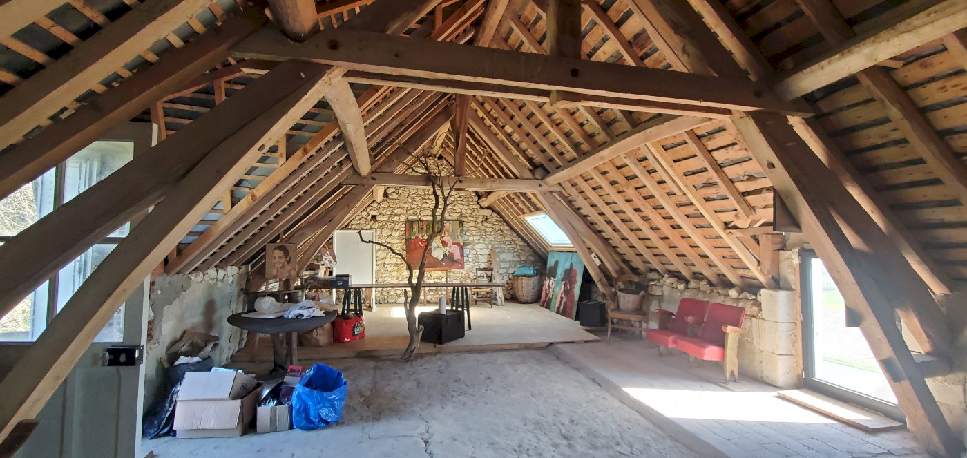 Un étage de 85 m², accessible par une charmante passerelle extérieure, offrant une magnifique charpente apparente.