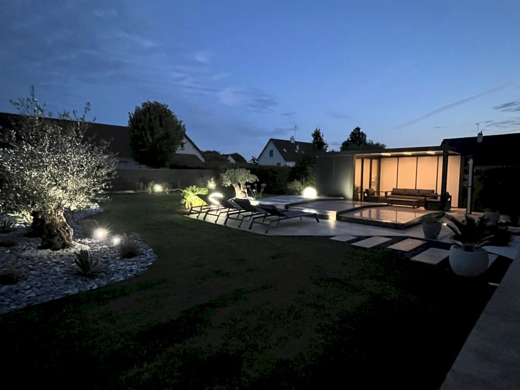 À l’extérieur, un magnifique jardin de très belle conception. Le soir vous pourrez totalement l’illuminer, mettant en valeur les plantations diverses, (palmiers, Oliviers) etc, arrosage automatique de la pelouse et goutte à goutte dans l’ensemble des massifs. Vous aurez l’agrément de vous rafraîchir dans une piscine de six par trois créée il y a un an, protégée par un dôme extra plat s’intégrant parfaitement dans le jardin. Une douche solaire est à votre disposition ainsi qu’une belle terrasse en travertin. Vous trouverez aussi un pool house avec une partie fermée pour stockage de produits piscine et une partie ouverte qui accueille votre salon de jardin pour soirées entre amis. Les midis et les soirées de printemps et d’été vous pourrez vous restaurer à l’abri d’une pergola bio climatique. Pour compléter cet extérieur, à l’arrière de la villa, se trouve un carport permettant d’abriter votre bois et de stationner un véhicule supplémentaire ainsi qu’une cour entièrement pavée.