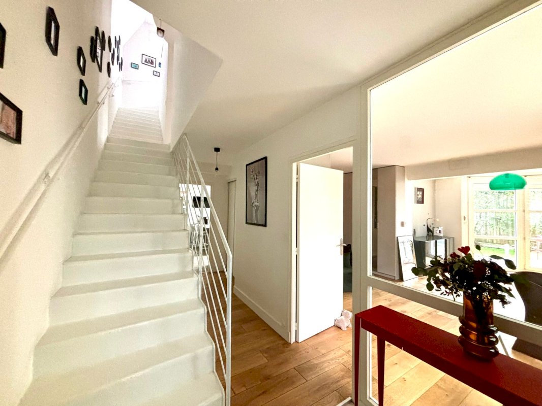 Une pièce de vie de 75 m² avec parquet massif, donnant sur un jardin aménagé exposé sud-ouest.
