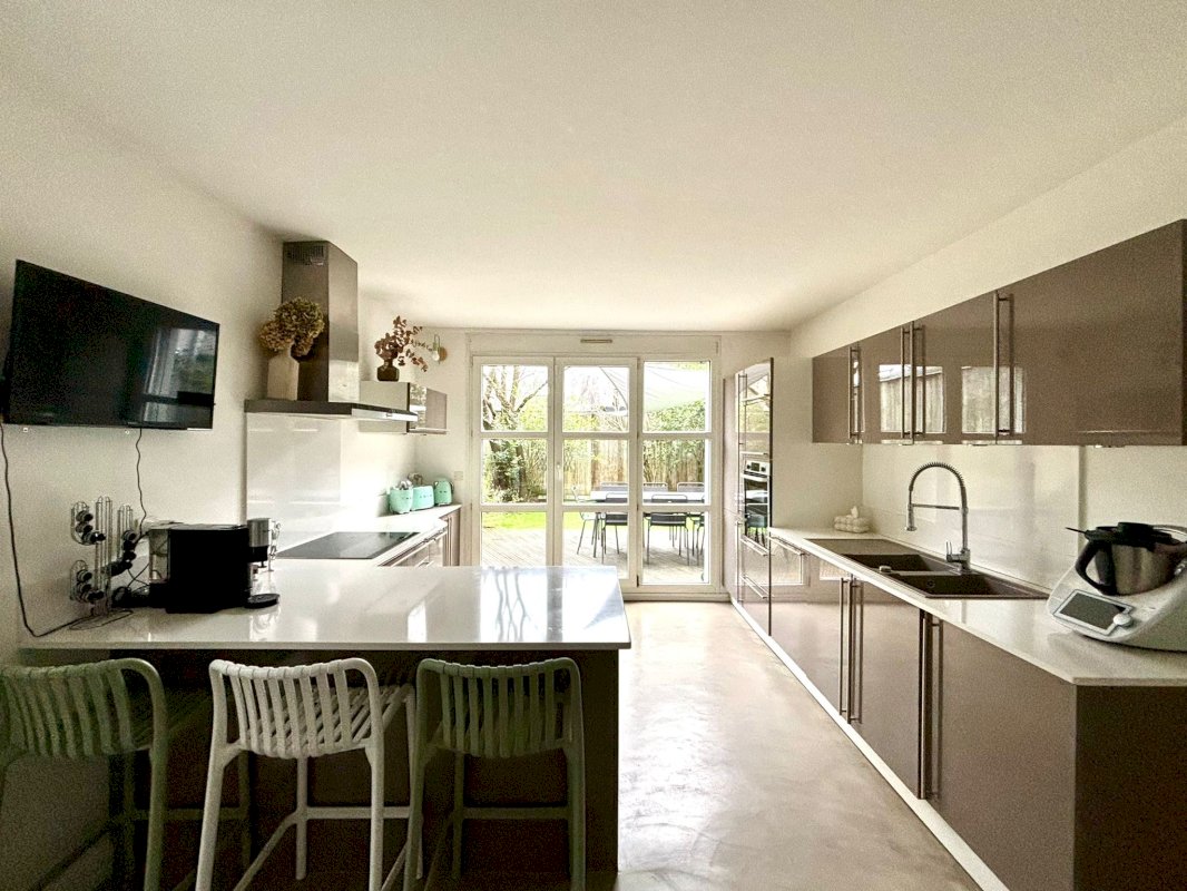 Cuisine équipée haut de gamme avec accès au patio privatif.