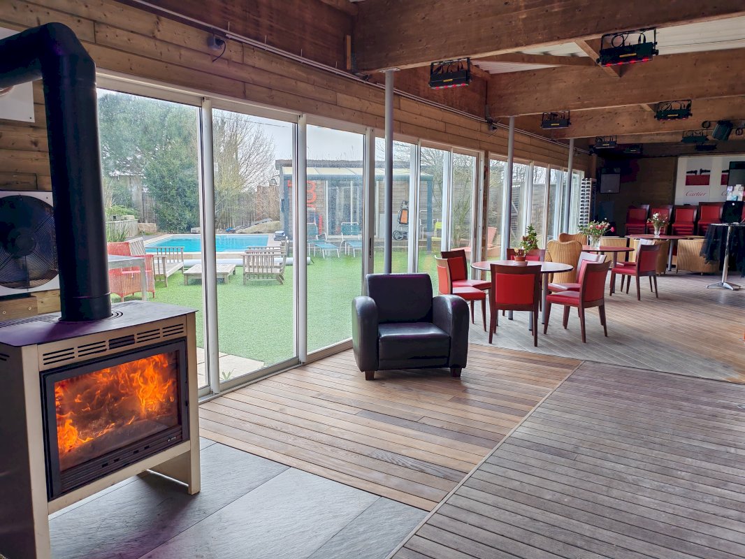 - Véranda chauffée avec spa intérieur, donnant sur terrasse et jardin paysager équipé d'un brasero.