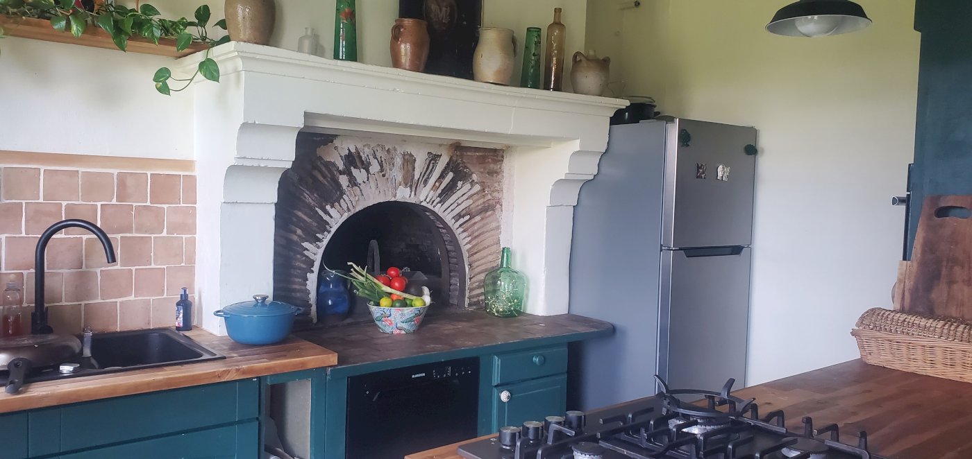 Dès l'entrée, vous découvrez une cuisine aménagée et équipée, sublimée par un ancien four à pain qui apporte un cachet unique et une véritable identité à la maison.