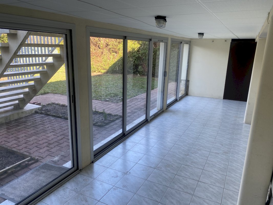 Le rez de chaussée se compose d’un garage, d’une pièce aménagée (chambre d’amis, bureau ou salle de jeux), d’une buanderie/atelier avec WC indépendant et d’un jardin d’hiver (dessous de terrasse, baies vitrées en double vitrage) encadré par deux débarras.
