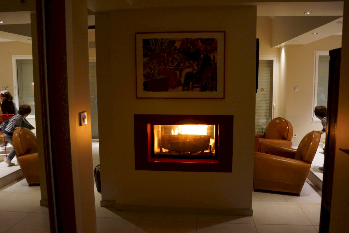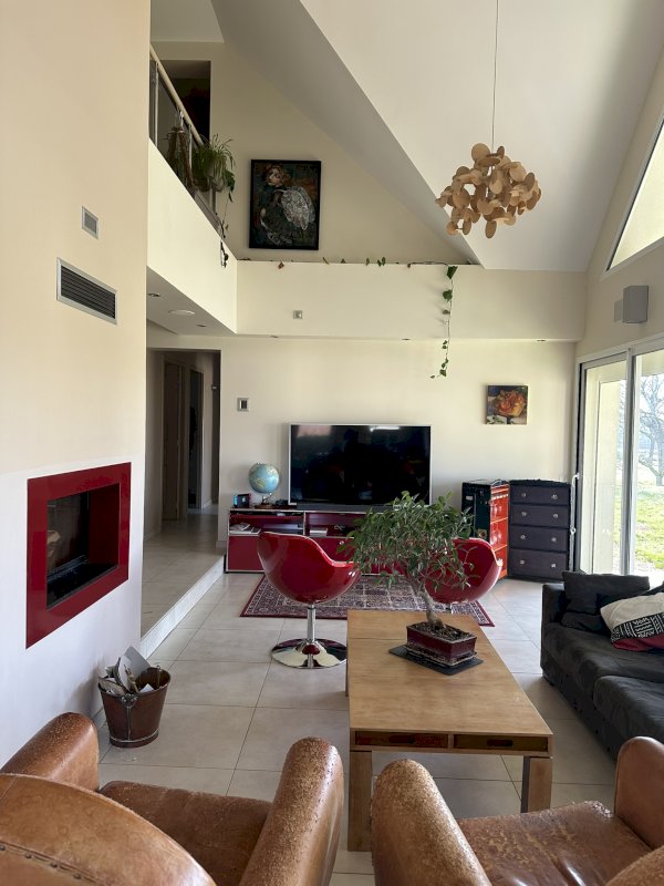 - Au rez- de chaussée : suite parentale avec salle d’eau et dressing, 2 chambres, salle de bain, toilettes, superbe salon cathédrale-salle à manger-cuisine ouverte (52,43 m²) organisés autour de la cheminée centrale double foyer, buanderie, cellier, bibliothèque sur mesure comme rampe d’escalier