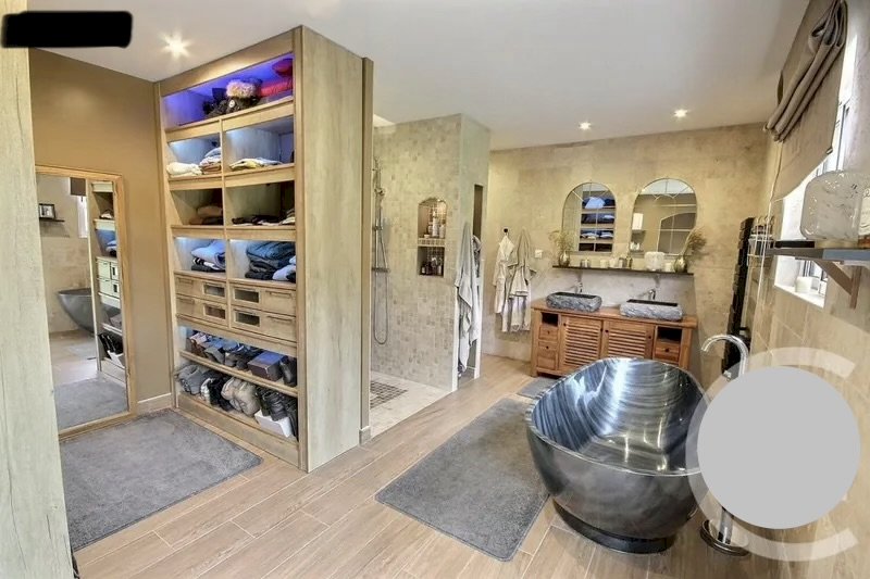 Maison faite par des artisans, compagnons du Devoir. Ce n’est pas une maison de constructeur, tout a été fait sur-mesure avec des matériaux nobles comme du chêne, du travertin et du marbre.