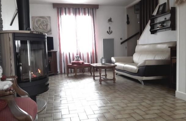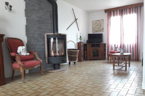 - cuisine aménagée ouverte sur un salon séjour équipé d'un poêle à bois installé en 2018,