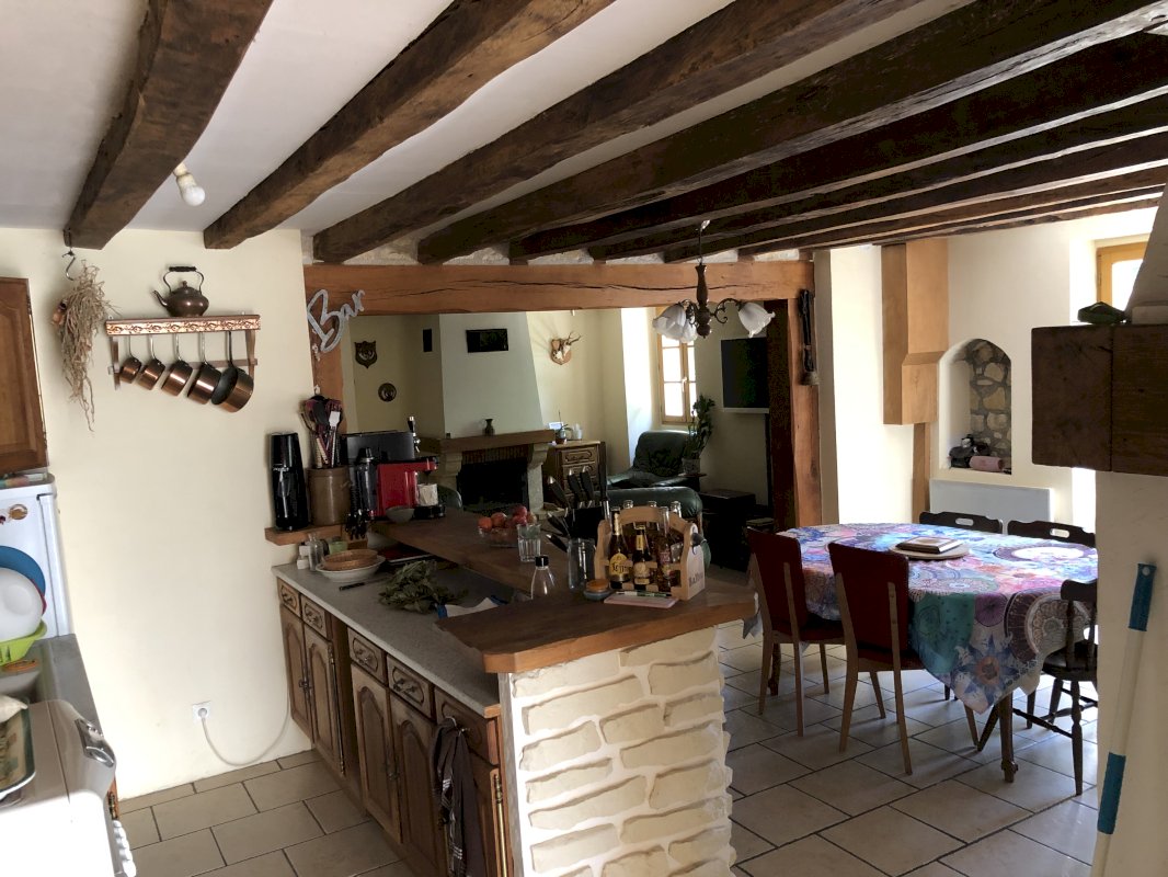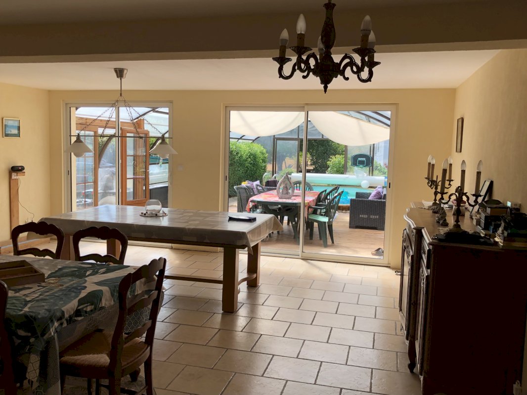 Dans la maison : grande salle à manger avec 2 baies vitrées donnant sur la véranda et un insert double face, un grand salon / cuisine avec insert, grande salle de bain, wc séparés, une grande cave semi enterrée, un grand garage isolé pour 2 voitures.