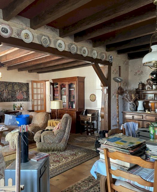 Elle s'ouvre sur un grand salon-salle à manger avec poutres apparentes et une cheminée fonctionnelle.