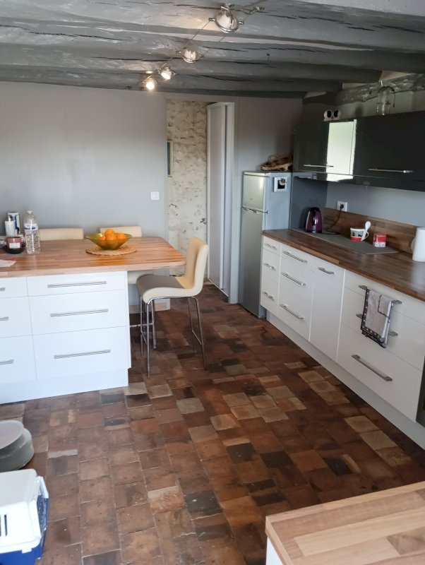 Cuisine moderne et conviviale avec îlot central et tomettes anciennes