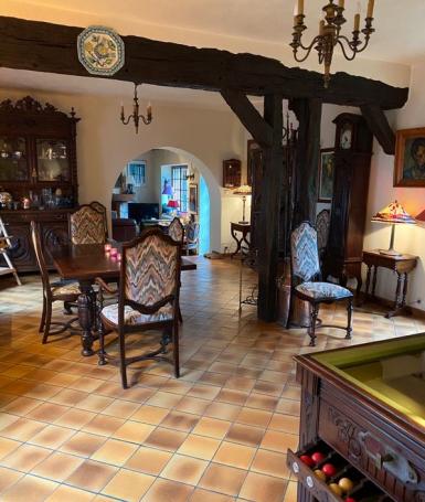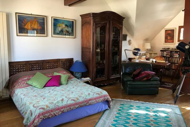 - 3 chambres dont 1 très grande avec plafond cathédrale poutres apparentes et baie vitrée à colombage, balcon-terrasse,