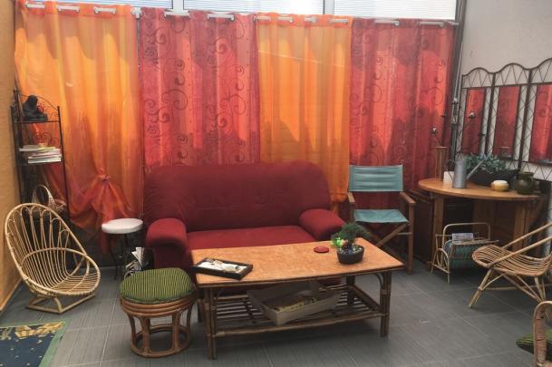 - véranda donnant sur petit jardin avec cabanon.