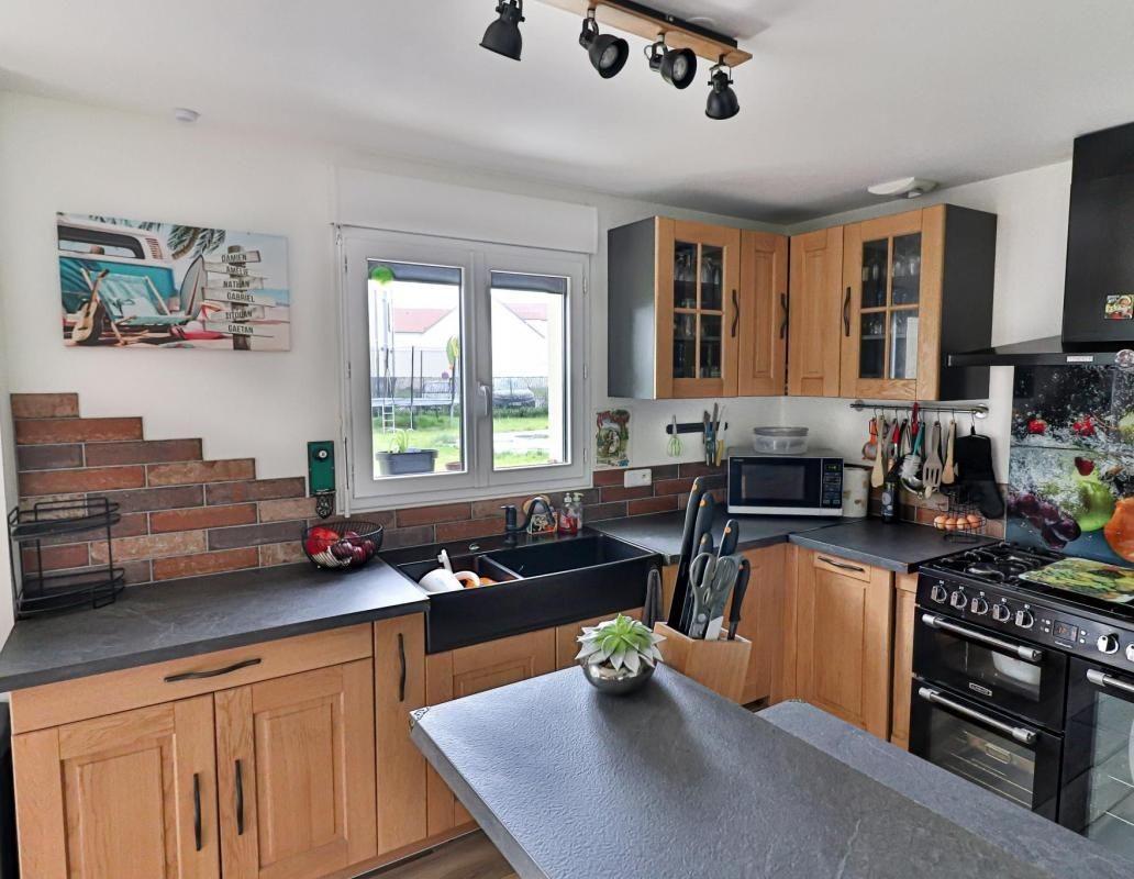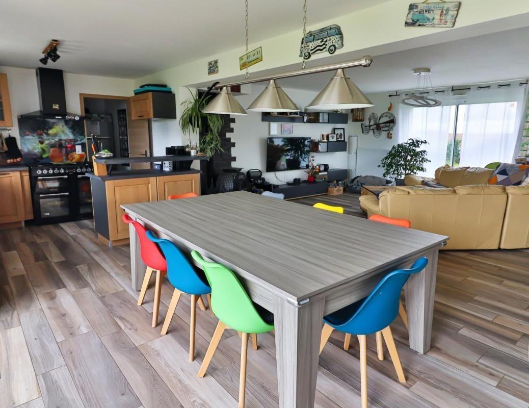 Au rez-de-chaussée, pièce de vie très lumineuse de 54m² (salon, salle à manger et cuisine ouverte). Poêle à bois.
