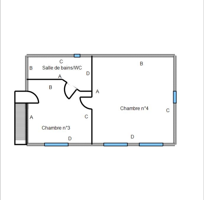A l’étage : salle de bain avec WC, 2 chambres (11 et 26m²) l’une à la suite de l’autre sous combles isolés.