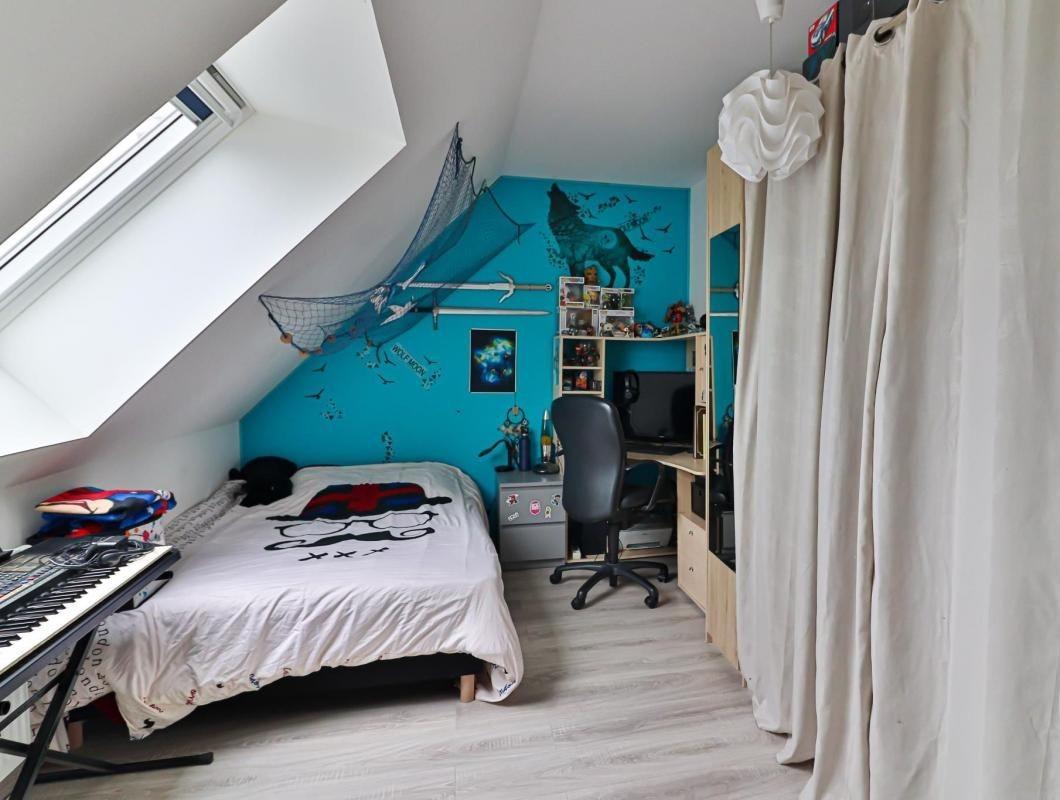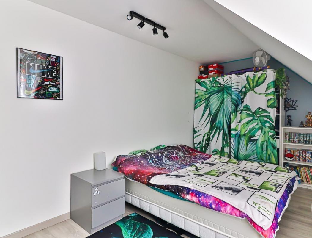 A l'étage, un couloir desservant 4 chambres dont une de 14m² traversante avec deux ouvertures (fenêtre velux) et une salle d'eau avec douche, wc, lavabo, meubles de rangement.