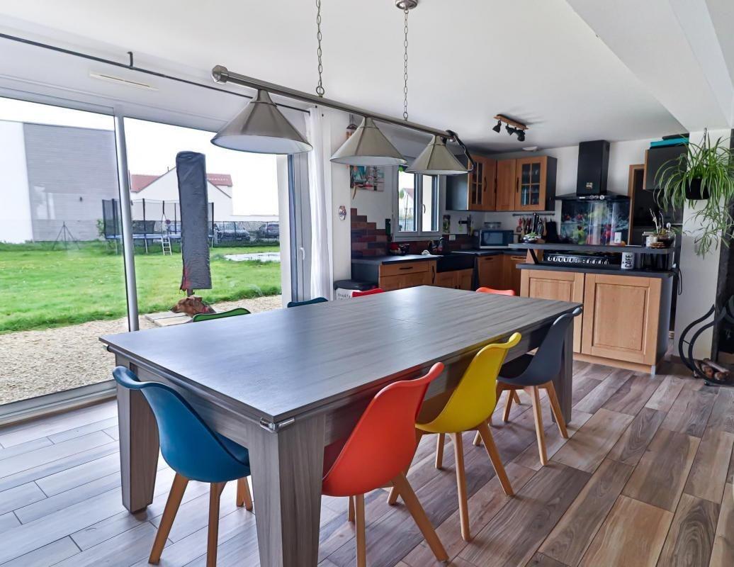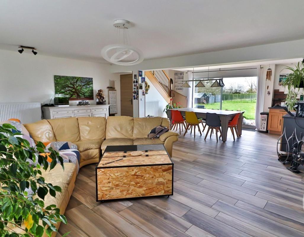 Au rez-de-chaussée, pièce de vie très lumineuse de 54m² (salon, salle à manger et cuisine ouverte). Poêle à bois.