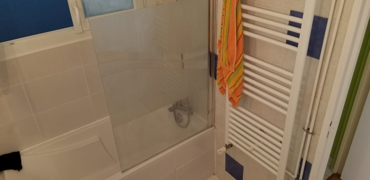 Salle de bains 3 m² avec baignoire récente et meuble vasque + Miroir.