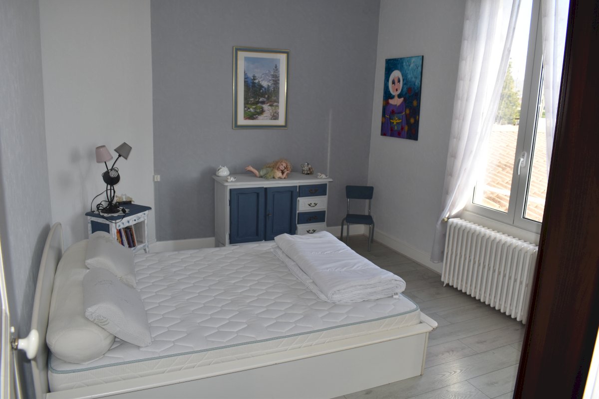 A l’étage, par escalier bois, espace nuit avec 2 chambres lumineuses de bonne taille et une pièce plus petite pouvant servir de bureau ou dressing ou comme c’est le cas actuellement, de chambre pour enfants (lits superposés + étagère).