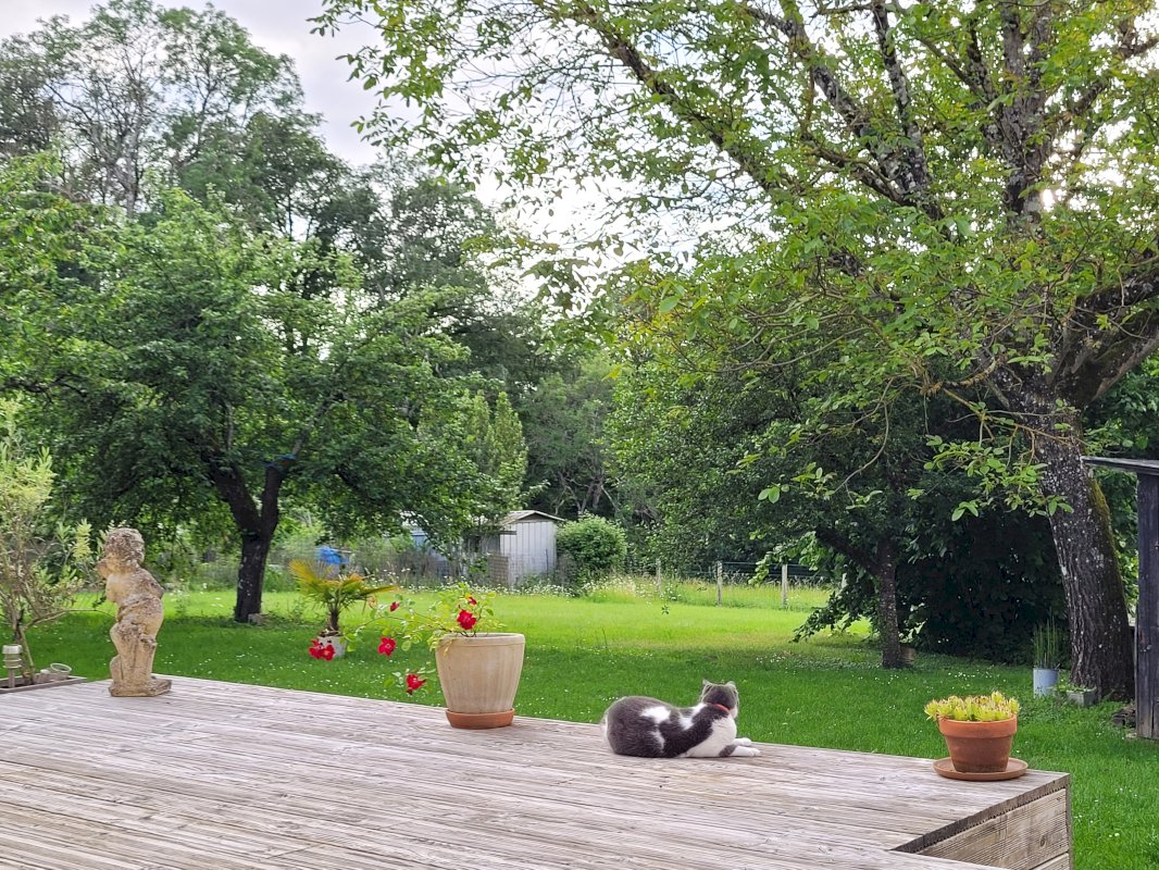 Terrasse bois donnant sur jardin clos et arboré. Belle vue sur forêt.