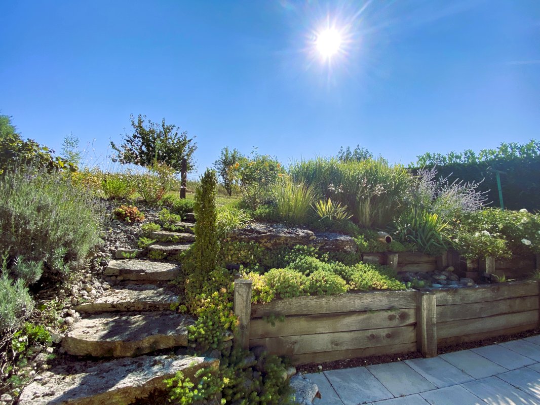 • Jardin paysager à la topographie naturelle, agrémenté de nombreuses variétés de fleurs et d’un escalier en pierres naturelles