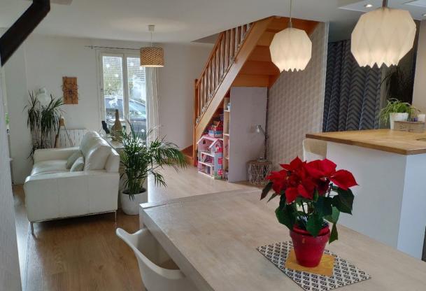 - un vaste espace de vie très lumineux de 55 m² avec poêle à bois ainsi qu'une cuisine ouverte et équipée qui donne sur une belle terrasse en bois de 40 m² à l'abris des regards,