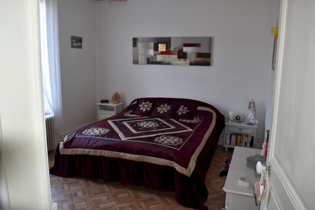 A l’étage, par escalier bois, espace nuit avec 2 chambres lumineuses de bonne taille et une pièce plus petite pouvant servir de bureau ou dressing ou comme c’est le cas actuellement, de chambre pour enfants (lits superposés + étagère).
