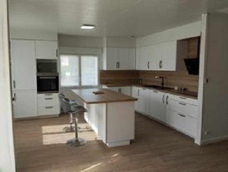 • Une cuisine toute équipée s’articulant autour d’un îlot central (four électrique, plaque à induction, lave-vaisselle, hotte et frigo-congélateur)