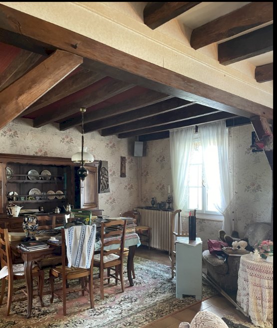 Elle s'ouvre sur un grand salon-salle à manger avec poutres apparentes et une cheminée fonctionnelle.