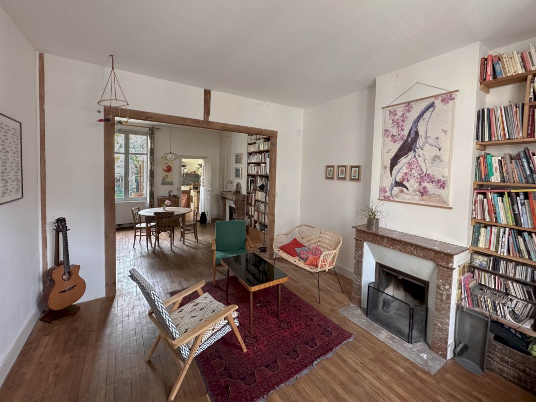 - Un salon-séjour de 30 m², avec une belle hauteur sous plafond et cheminée fonctionelle, qui s'ouvre sur un jardin arboré et sauvage.