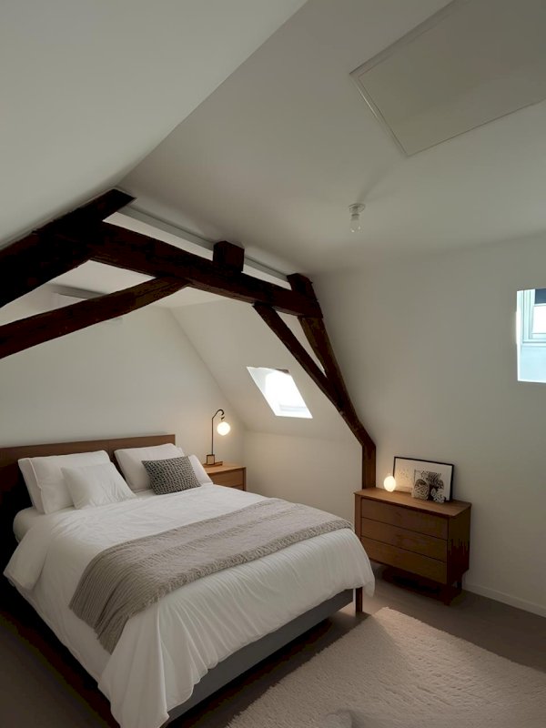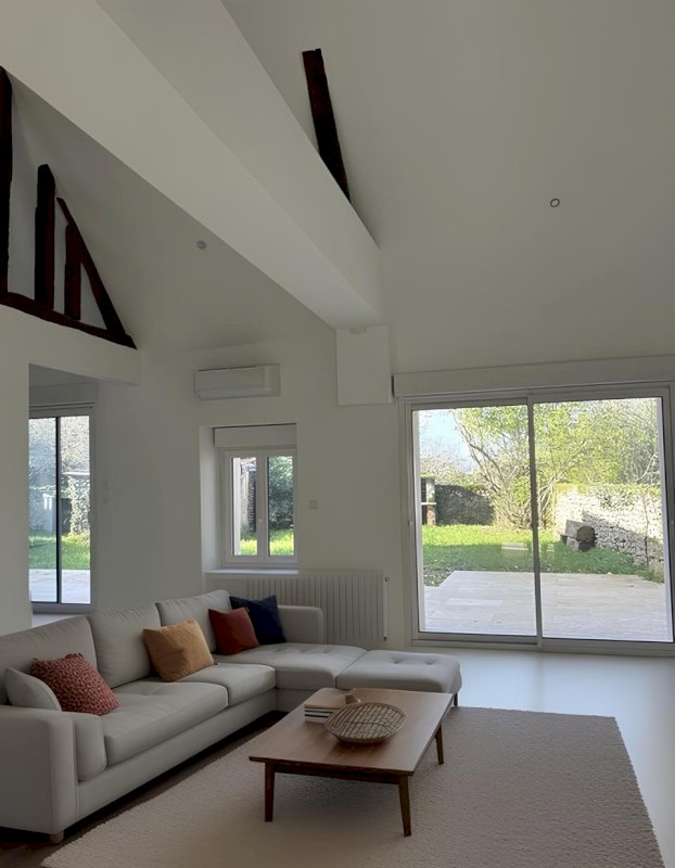 Dès l'entrée, vous découvrirez un espace de rangement et des toilettes séparées. La pièce de vie est spacieuse, avec son toit cathédrale et ses poutres apparentes elle est baignée de lumière et de charme. Elle offre un espace salon confortable avec son coin cheminée et une cuisine élégante de l'autre côté.