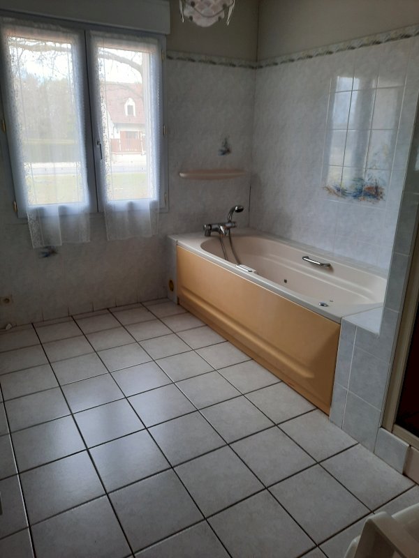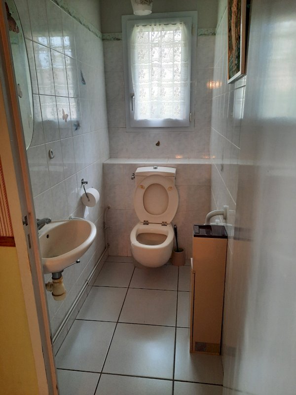 Maison de plain-pied de 1992 comprenant cuisine, grande salle à manger salon avec cheminée, couloir, salle de bains (douche et baignoire), WC, 2 chambres, grande buanderie (possibilité de faire une 3ème chambre dans la buanderie).